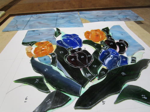 基本的なステンドグラス技術。ステンドグラスは完成させるまでの工程が結構あります。様々な作品作りを通してその内容を進めてゆきます。全く経験の無い方の場合は教室によりますが最初の1点2点目を終えた位からこんな感じでステンドグラスが出来上がって行くんだな、と理解し始める事と思います。基本的な技術ですが型紙作りからガラスカットや半田付けなどの全般の作業において教室で生徒さんがまーまー慣れて来たなと感じるのが1年から2年位だと思います。個人差、参加時間や学ぶ教室によりこれら内容は異なってきます。