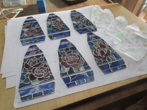 今回紹介している生徒さんは大輪の薔薇を主題に作ってくれました。各面大きめの薔薇が迫力のあるステンドグラスになります。制作の後半になりますが完成まじかでワクワクする時期ですね。