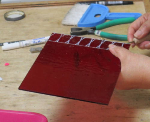 同じ形のガラスピースを多く作って行くモザイク調のステンドグラスはガラスカットも単調な作業になりますがひとつひとつのガラスピースを型紙通り綺麗に作って行かないと完成度は低くなってしまいます。