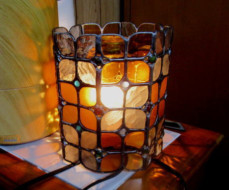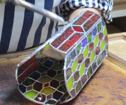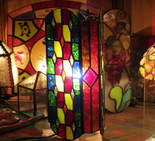 こちらの作品は過去に教室へ参加頂いた生徒さんのもの。過去記事にもアップしていると思います。少し凝ったモザイク調の筒形ランプ。小型の作品ですが鮮やかな色合いのステンドグラスです。