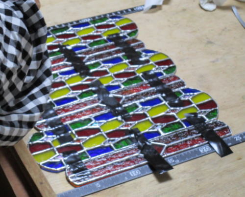 綺麗に組めましたね。モザイク調のデザインはステンドグラス作品制作では基本の内容となります。お花や動物、静物、風景等の様々なデザインをステンドグラスでは制作しますが経験を積んで行くとこのモザイク調のデザインは奥が深い事が解って来ると思います。モザイク調のデザインを考案し始めると結構悩みます。かえって絵柄を入れた方が楽なのかな、、と感じたりもするはずです。また絵柄とモザイクを融合させたステンドグラスも世の中の多く有り制作者の意欲も膨らむ内容です。デザインなどの話になるとキリがないので気を付けていますがこのモザイクはステンドグラスの原点とも言われるもので素晴らしい作品が多く有ります。モザイク柄の資料は世の中にも多く有るので色々参考にしてこれからもステンドグラス制作に是非取り入れて頂ければ嬉しいです。